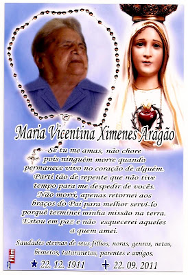 A FAMÍLIA DE MARIA VICENTINA XIMENES ARAGÃO, PROFUNDAMENTE CONSTERNADA COM O SEU FALECIMENTO, CONVIDA OS PARENTES E AMIGOS PARA MISSA DE 7º DIA DE FALECIMENTO, QUE REALIZAR-SE-Á NO DIA 28/09/2011, QUARTA-FEIRA, ÀS 19HS NA IGREJA NOSSA SENHORA DO NAZARÉ (FAZENDA ALEGRE).