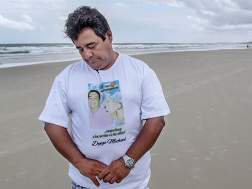 Domingos concordou em falar ontem sobre o tema, mas longe de sua casa –prefeiru um local perto do mar. A voz era pausada e o olhar, distante. Vestia uma camisa branca com a foto do filho e a frase: "No meu coração onde quer que eu vá".