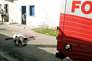 O rapaz tentou fugir dos assassinos, mas não conseguiu. Acabou sendo baleado na Rua Canário e tombou sem vida na Rua São Bernardo (Foto: Bruno Gomes)